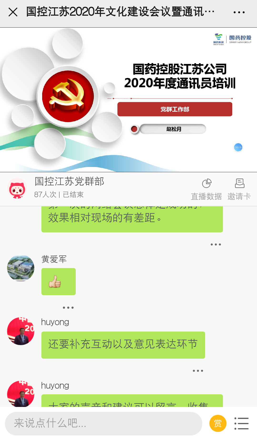 党群部传达了胡勇书记关于2020年文化建设的有关思考,胡书记强调文化建设与企业管理经营密切相关,随着江苏公司不断壮大,通过文化建设统一思想、提高企业认同感、归属感就格外重要,2019年是国控江苏文化建设的元年,在摸索和实践中启动并逐步完善,2020年文化建设要实现从有到优,从点到面,从单到互,从泛到专的转变,真正达到为国家承担社会责任,为企业提升软实力,为员工提升幸福感的服务目标。