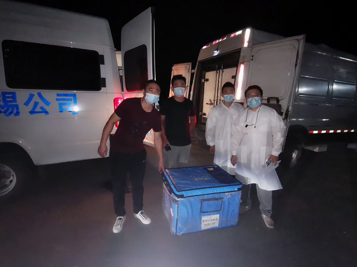 7月24日凌晨2点,国控江苏南京物流与国控无锡物流联动配合,国控江苏物流部部长朱小强、驾驶员步磊、验收员马金坤与国控无锡总经理助理陆技峰、物流经理诸瀛锋、驾驶员杨伟东、梁大鹏等人携手合作,成功将药品转运至南京汤山公共卫生医疗中心,在药品下线后四小时内,从位于无锡的药厂送至南京抗疫一线!